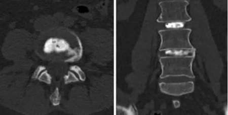 CT軸位和前后位顯示L4-5間盤造影和血小板注射。