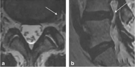 MRI示血小板注射前L4-5間盤膨出,箭頭示高密度區(qū)